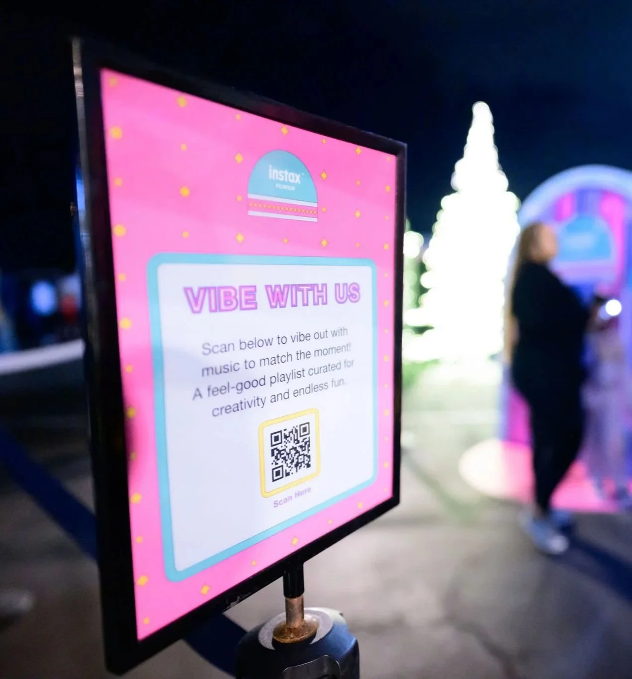 Signature summer-tour elements—vibrant color, glowing details, and ornate type—returned with a festive holiday twist, layered with winter-inspired graphics and warm lighting that elevated the seasonal atmosphere. The joy of gifting was celebrated through playful, photo-ready experiences inspired by instax.
