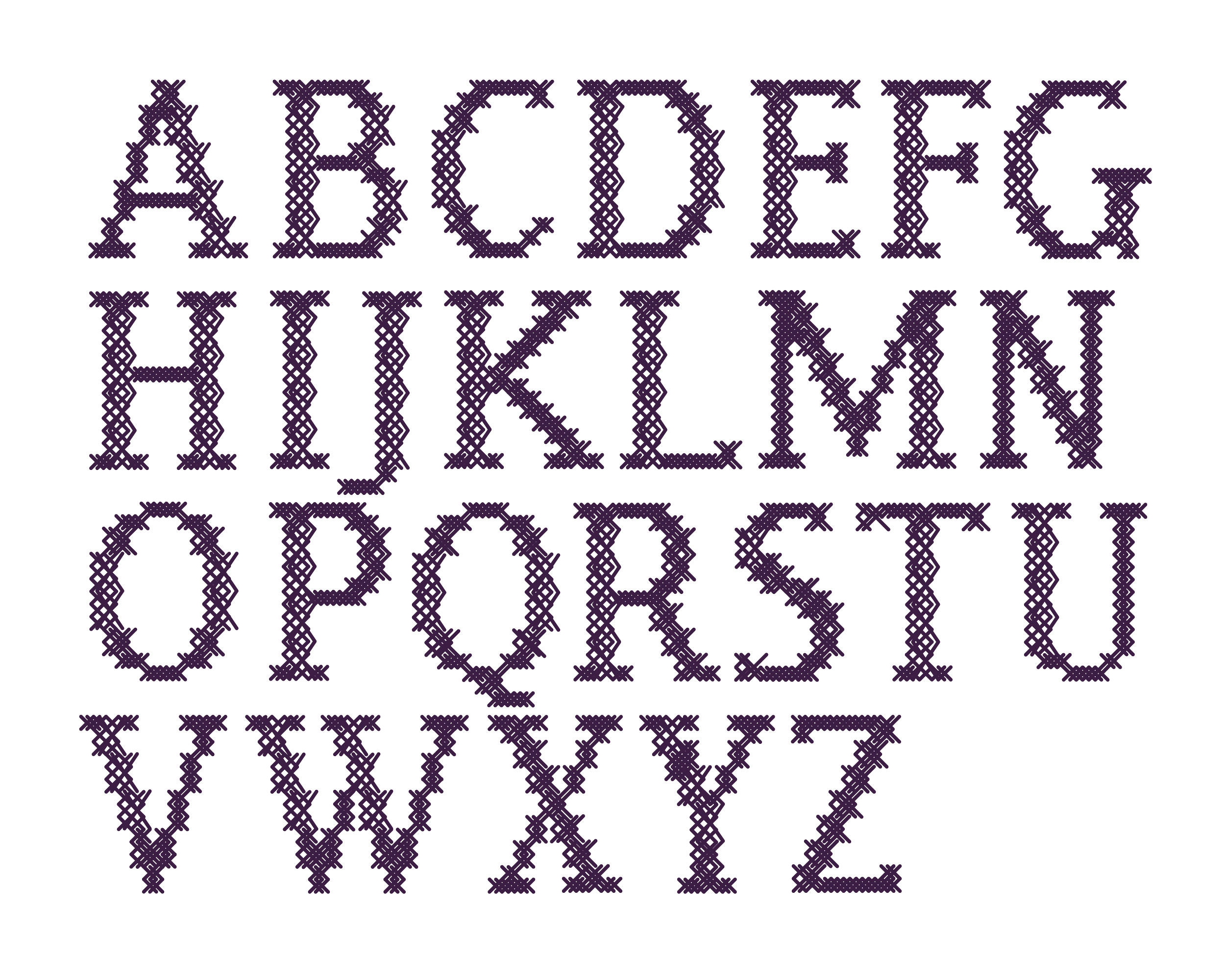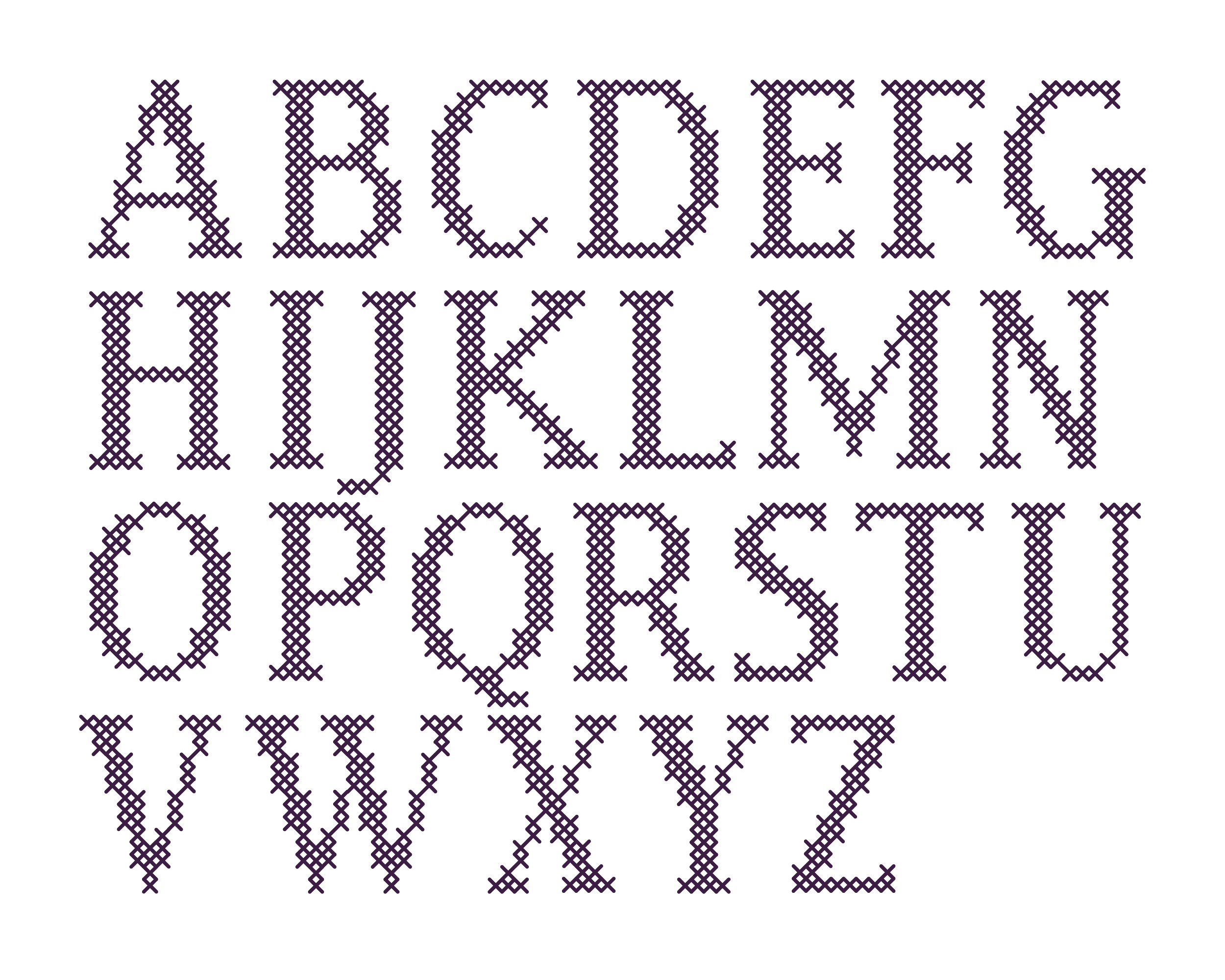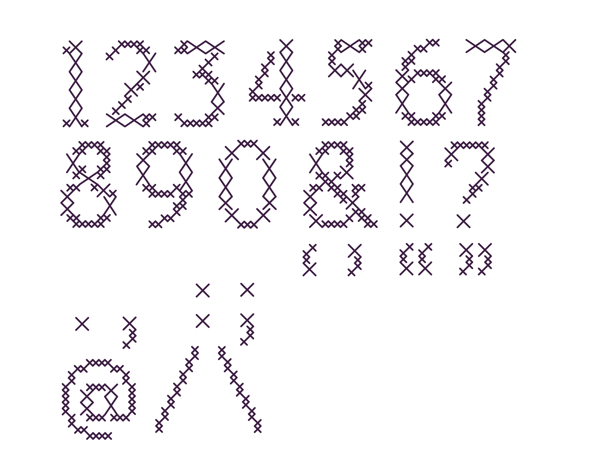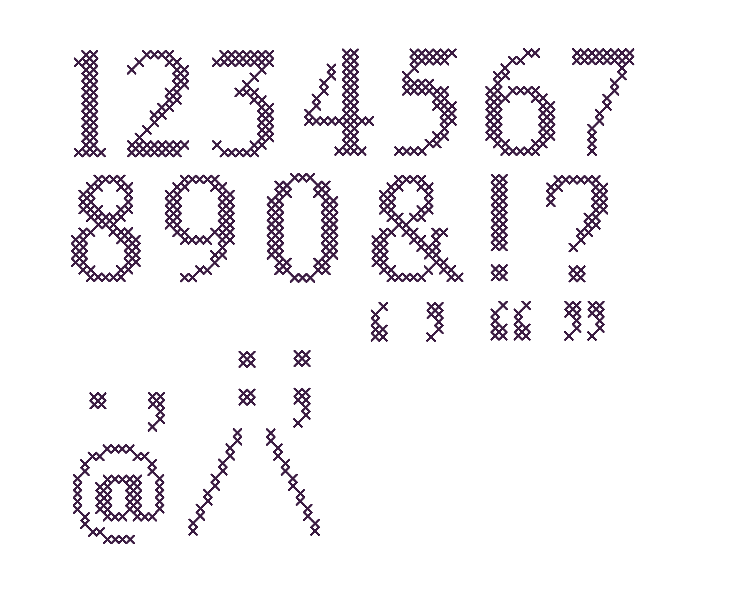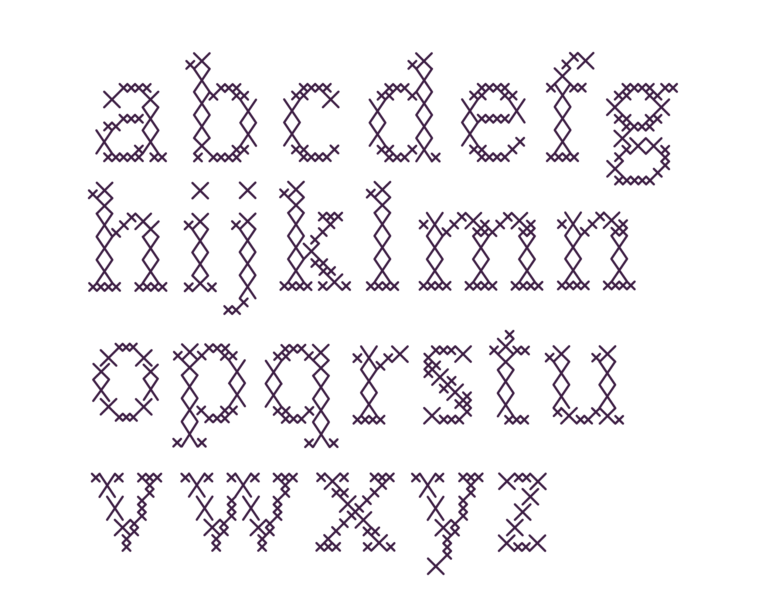 Using LoRes 21 from Emigre, I designed three variations of the font: 1x, 2x, & 3x. 1x is made of all 1:1 stitches, and represents the regular weight of the bunch. 2x incorporates larger asymmetrical stitches to appear light. 3x is both 1x & 2x layered on top of each other, creating a bold face.